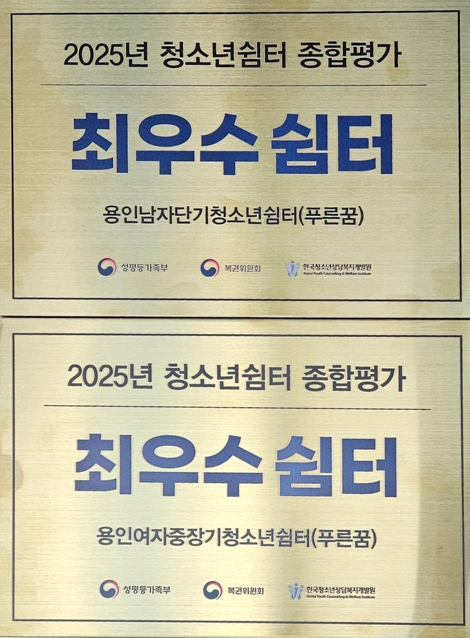 용인신문 | 성평등가족부가 전국 청소년쉼터 134개소를 대상으로 실시한 ‘2025년 청소년쉼터 종합평가’에서 ‘용인푸른꿈단기청소년쉼터’와 ‘용인푸른꿈중장기청소년쉼터’가 나란히 최우수기관으로 선정됐다. 두 쉼터는 S등급 중에서도 상위 21개소에만 수여되는 최우수기관 현판을 지난 평가에 이어 올해에도 수상했다.