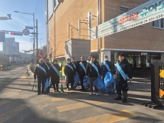 양지신협 제16대 임원 당선인과 직원들이 선거기간 뿌려진 유인물을 치우기 위해 길거리 청소에 나섰다