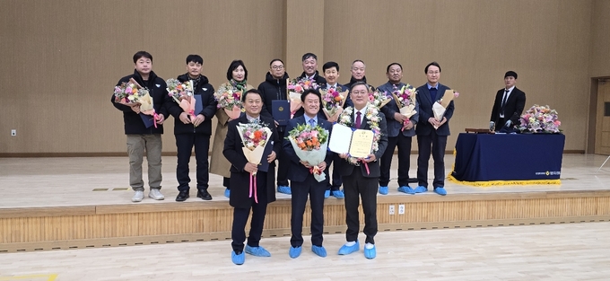 양지신협 제47차 정기총회를 마치고 앞줄 좌로부터 배정학 부이사장, 신학철 현 상임이사장, 이규재 상임이사장 당선인과 함께 뒷줄 이사, 감사 등 당선인들이 축하 꽃다발을 들고 감사인사를 하고 있다