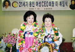 이날 이임한 이봉애 회장(사진 왼쪽)은 이임사에서 “아름다운 여성으로서가 아니라 산업 전선에서 성취감을 느끼며 끝없이 일과의 싸움에서 승리의 미소를 보여주는 여성 CEO에 자랑스러움을 느낀다”며 “경제가 어렵고 힘들어도 한마음 한뜻으로 위기를 기회로 만들어 용인에 우뚝 설 수 있는 경영 성과를 만들자”고 했다.