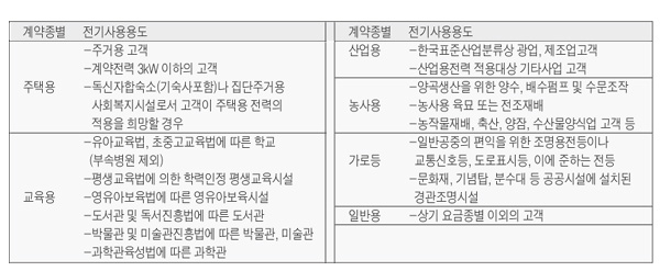 A)우리나라의 전기요금체계는 전기를 사용하는 용도에 따라 6가지 계약종별로 구분하여 운영하고 있으며, 종별 전기공급비용, 에너지정책 등 여러 요인이 반영되어 종별간 요금수준에 차이가 있습니다.