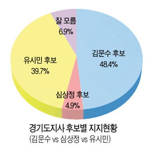 경기도지역신문협회가 여론조사 전문기관인 모노리서치에 의뢰해 지난 18일 경기도 31개 시·군 19세 이상 성인남녀 1459명을 대상으로 실시한 ARS 전화설문조사에서 김문수 후보는 48.4%를 얻어 39.7%의 지지를 얻은 유시민 후보를 8.7% 앞섰다.
