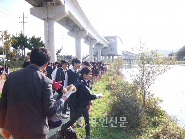 | ▲ 경안천의 환경보존을 위해 용인중학교 학생들의 EM흙공을 던지고 있다. | ||