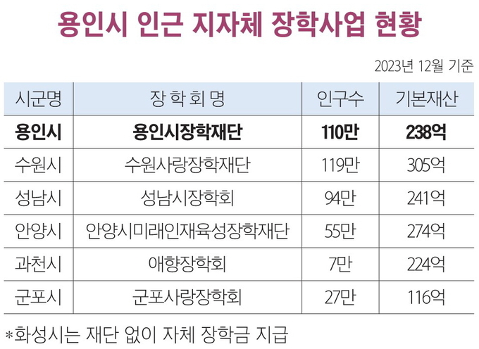 용인 인근 지자체들이 자체 출연한 장학재단(장학회) 기본재산을 보면 △용인시(인구 110만) =용인시장학재단 238억 원 △수원시(인구 119만) =수원사랑장학재단 305억 원 △ 성남시(94만 명) =성남시장학회 241억 △안양시(인구 55만) =안양시미래육성재단(장학재단) 274억 △과천시(인구 7만 명) =애향장학회 224억 원 △군포시(인구 27만) =군포사랑장학회 116억 원 등이다. 반면, 화성시는 별도의 장학기구 대신 시에서 장학금 전담 업무 직원 1명을 두고, 운영 중이다. <도표 참조>