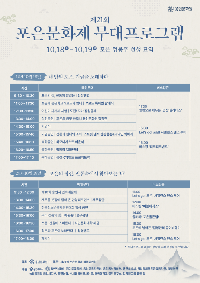 둘째 날인 19일은 “포은의 정신, 진솔 속에서 찾아보는 ‘나’”를 주제로 오전 9시 30분부터 제10회 용인시 민속예술제가 펼쳐진다. 오후 1시 30분에는 ‘재주를 봇짐에 담아 온 만능퍼포먼스’를 선보이는 재주 상단 공연이 이어지며, 2시부터는 전국 청소년 국악 경연대회 입상 공연이 진행된다.