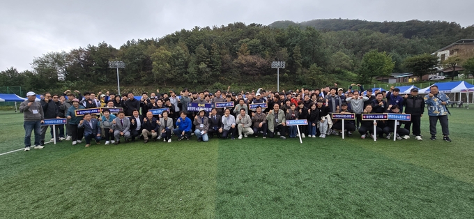 제34회 용인노동가족한마음대축제 참석자들이 단체사진으로 하나된 모습을 보이고 있다