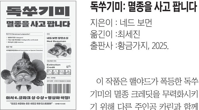 이 작품은 핼야드가 폭등한 독쑤기미의 멸종 크레딧을 무력화시키기 위해 다른 주인공 카린과 함께 물고기를 찾아나선다는 설정이면서 인류의 암담한 미래를 보여주는 블랙코미디적 작품이기도 하다. 핼야드의 세계에서는 목적을 위해 언제든 유전자조작을 하고, 생태에 대한 양심이나 도덕은 없다. 인간이 생태를 지킨다는 이유로 유전자조작을 하고 직접적 개입을 하지만 그 이면은 복잡한 이해관계가 얽힌데다 기술적인 문제도 있어 보인다. 그래서 소설은 멸종이 아님을 확인하려는 캐릭터가 멸망한 종이 되었다는 측면에서 아이러니다.
