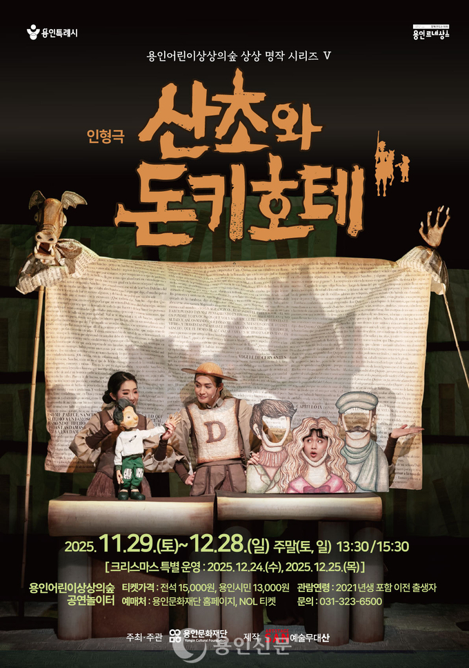 용인신문 | (재)용인문화재단은 오는 29일부터 12월 28일까지 용인어린이상상의숲 공연놀이터에서 가족 인형극 ‘산초와 돈키호테’를 선보인다. 이번 작품은 원작 ‘돈키호테’속 상상력과 모험을 어린이의 시선으로 재해석한 창작 인형극으로, 웃음과 감동을 함께 전하는 가족형 공연이다.