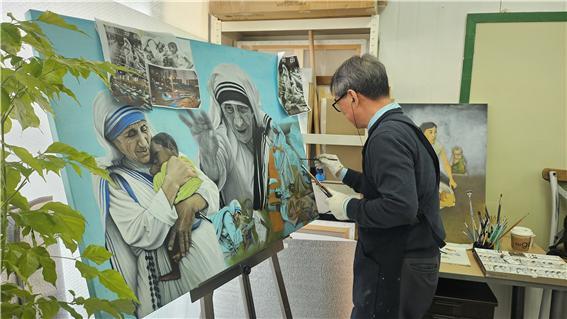 전종화 작가가 2025 경기미술대전 특선에 빛나는 위대한여정25-헌신2를 작업하고 있다