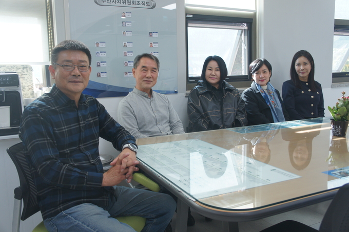 좌로부터 이종현 마북동주민자치위원장과 전종화 작가, 이은정 강사, 김승미 작가, 이서영 작가가 센터 사무실에서 만나 정담을 나눴다