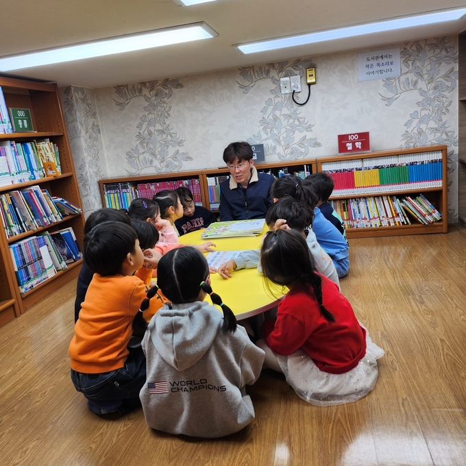 사서인 김승호 교사가 병설유치원생들과 함께 책읽기를 하고 있다