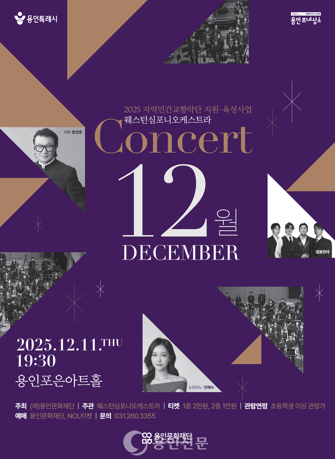 2023년부터 용인문화재단의 ‘지역 민간 교향악단 지원·육성사업’ 수행단체로 활동하고 있는 웨스턴심포니오케스트라는 12월을 장식하는 이번 공연을 통해 클래식, 재즈, 팝, 영화 음악 등 가족들과 함께 즐길 수 있는 다채로운 장르의 무대를 펼칠 예정이다.