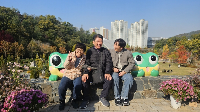 영흥수목원에서 근로자 3명이 개구리 모양의 벤치에 앉아 밝게 웃으며 포즈를 취하고 있다. 작업 환경 외에서 근로자들이 여가 시간을 즐기고 친목을 다지고 있다