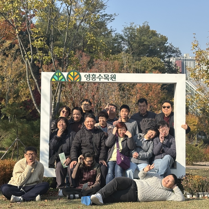 가을 야외 활동 모습. 기흥직업지원센터 근로자들이 영흥수목원 기념 액자 프레임 앞에서 환하게 포즈를 취하고 있다. 근로자들의 정서적 안정과 사회성 함양을 위한 문화 활동의 일환이다