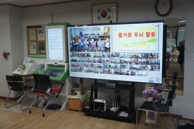 어르신들이 대형 스크린을 통해 전달되는 인지 활동 교육에 집중하고 있다. 스마트 기기가 낯설 법도 하지만 이제는 일상의 즐거움으로 받아들인다