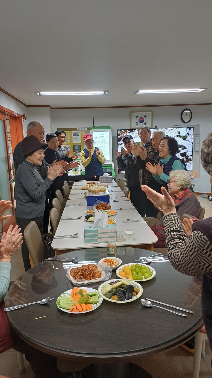 풍성하게 차려진 음식 앞에서 박수를 치며 자축하는 회원들에게는 ‘보라동 유일 선정’이란 자부심이 얼굴마다 가득하다