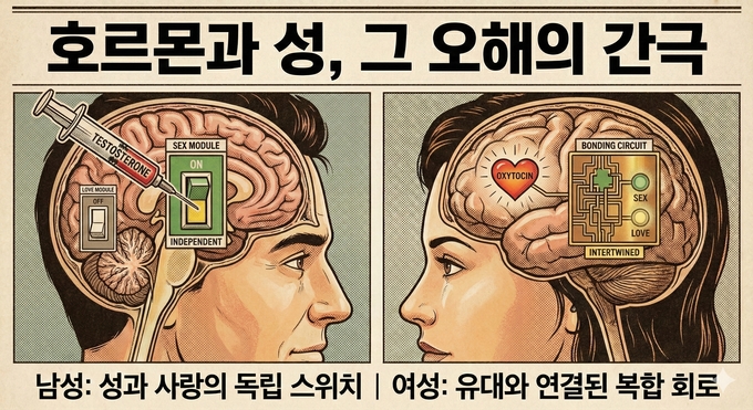 호르몬 환경도 이 차이를 키운다. 테스토스테론은 남성의 성욕을 직접적으로 끌어올리는 호르몬이다. 이 호르몬은 사랑을 묻지 않는다. 대상이 있고 자극이 있으면 반응을 촉진한다. 여성의 성 반응이 옥시토신처럼 유대와 연결된 호르몬과 더 긴밀히 얽혀 있는 경우가 많은 것과 대비된다. 물론 개인차는 크다. 모든 남성이 같지 않고, 모든 여성이 같은 방식으로 반응하지도 않는다. 다만 평균적으로 보았을 때 그러하다는 이야기다.