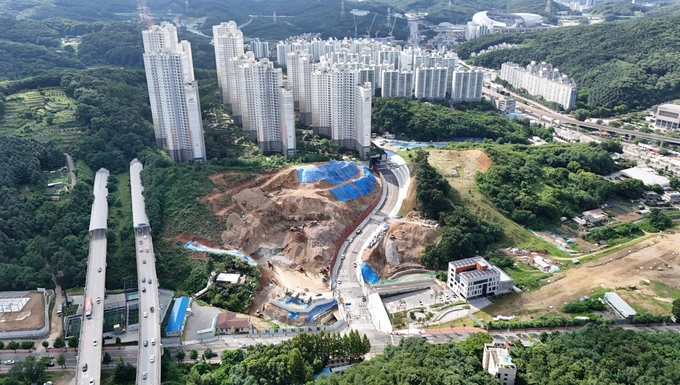 임시 도로가 개설된 삼가2지구 민간 임대아파트 모습.