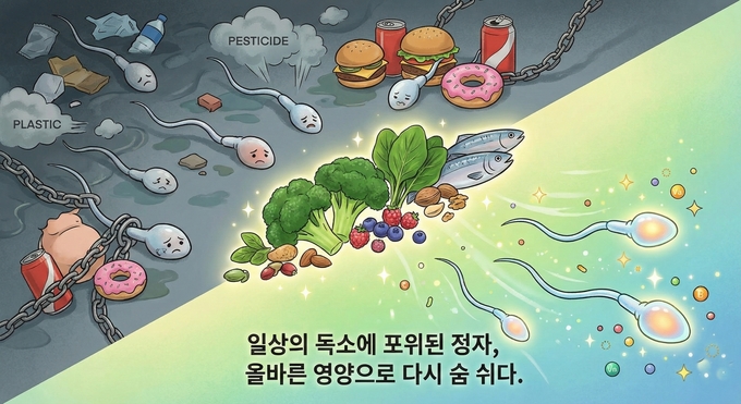 문제는 현대 인간, 특히 남성의 생식력이 이 구조와 점점 멀어지고 있다는 데 있다. 오늘날 남성의 정자 건강은 의지나 기력보다 환경과 음식 문화의 영향을 훨씬 크게 받는다. 공해, 환경 호르몬, 플라스틱과 살충제, 미세플라스틱 같은 물질들은 조용하지만 집요하게 생식 기능을 압박한다. 여기에 가공식품 위주의 식단, 잦은 외식과 단 음료가 더해지면 정자는 버티기 힘든 환경에 놓인다. 비만과 인슐린 저항성, 대사증후군 역시 정자 품질을 떨어뜨리는 직격탄이다. 흔히 술과 담배를 먼저 떠올리지만, 사실 그보다 더 무서운 요소들이 이미 일상 곳곳에 깔려 있다.