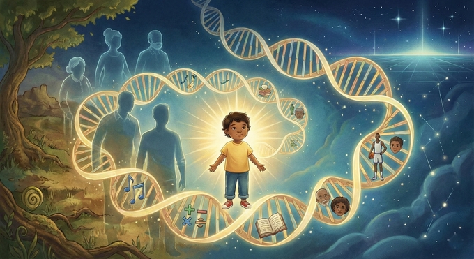 결론부터 말하자면 자식은 부모를 닮는다. 다만 부모만 닮지는 않는다. 아이는 친가와 외가를 통틀어 조부모, 때로는 증조부모의 형질까지 함께 물려받는다. 키와 얼굴, 체질과 성격, 학습 능력에 이르기까지 대부분의 특징은 하나의 유전자가 아니라 수십, 수백 개의 유전자 조합으로 결정된다. 이 유전자들은 세대를 건너뛰며 잠들어 있다가, 어느 순간 불쑥 모습을 드러낸다. 그래서 한 집안에서 유독 키가 크거나, 음악적 감각이 뛰어나거나, 숫자 앞에서 유난히 강한 아이가 등장한다. 선대에 묻혀 있던 가능성이 아이의 몸에서 다시 깨어나는 순간이다. 그런 의미에서 자식은 태어나는 순간부터 이미 과거와 미래를 함께 품고 세상에 나온다.