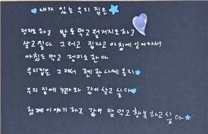 내가 있는 우리 집은 장진수 정리 하고 밥도 먹고 설거지도 하고 살고 싶다 그러고 잠자고 아침에 일어나서 아침도 먹고 정리도 한다 우리집은 그래서 편한 나의 둥지 우리 집에 누군가와 같이 살고 싶다 함께 이야기 하고 같이 밥 먹고 행복하고 싶다 장진수 지적장애(중증) 2024년 개인시집 출간(4인 4색 사업)