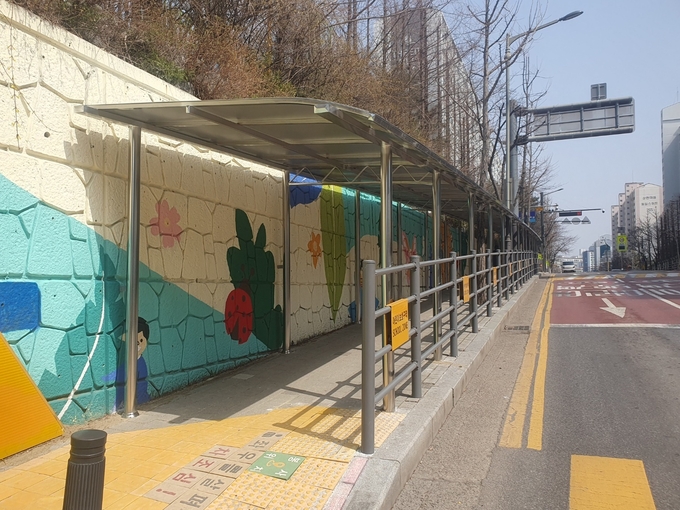 용인시민들의 생활환경 안전 분야 만족도가 95%인 것으로 조사됐다. 사진은 통학로 안전 강화를 위해 캐노피가 설치된 수지구의 한 초등학교 앞 보행자 도로 모습.