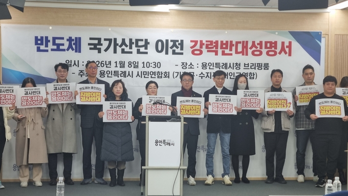처인구시민연대 등 9개 시민단체로 구성된 용인특례시 시민연합회 관계자들이 지난 8일 시청 브리핑룸에서 반도체 지방 이전 주장에 대한 반대 성명서를 발표했다.