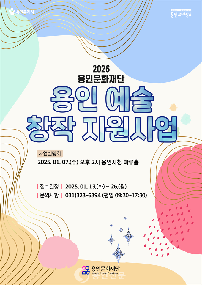 용인신문 | 용인문화재단은 기존 ‘문화 예술 공모 지원사업’을 전면 개편, 사업명을 ‘2026 용인 예술 창작 지원’으로 바꾸고 새롭게 전환한다. 13일부터 26일까지 접수를 통해 총 6억 400만 원을 차등 지원한다.