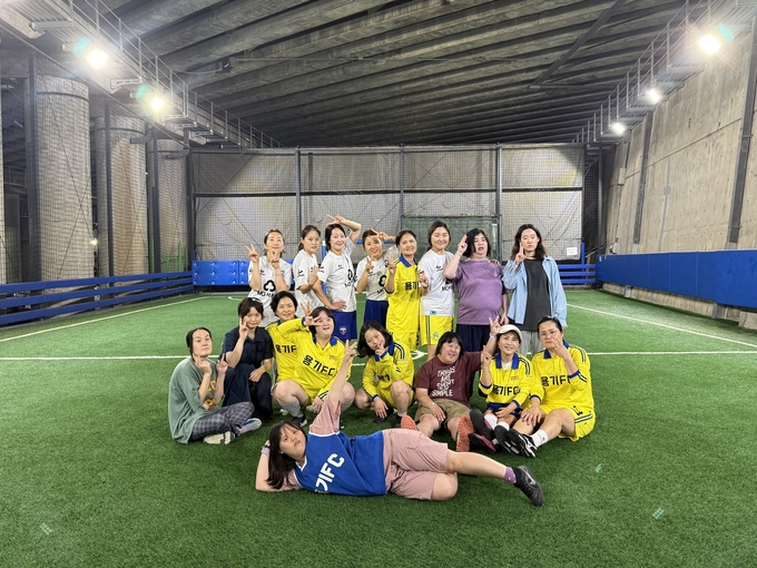 기흥장애인복지관 여성발달장애인 풋살팀 '용기 FC'가 창단식후 함께 모여 단체사진을 촬영하고 있다
