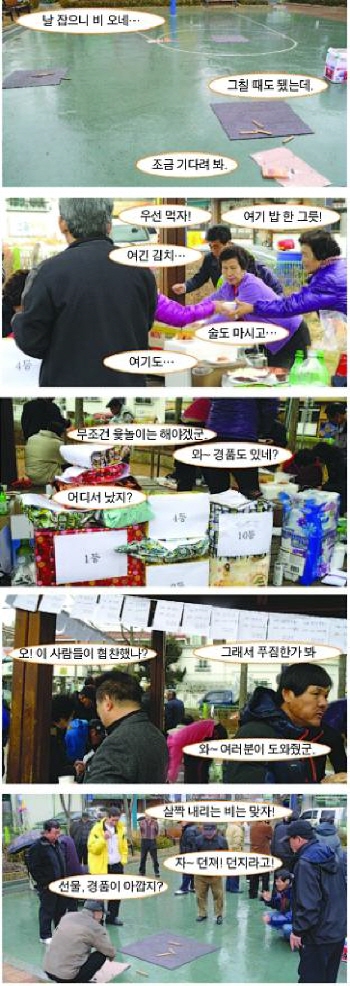 지금은 지역 인사들의 배려로 음식과 경품까지 준비하는 마을 주민 전체의 잔치가 됐다. 비가 흩뿌리는 날씨였는데도 어르신들은 거나한 술 한 잔과 음식의 즐거움에 윷놀이 판으로 모여 시간 가는 줄 모르는 하루였다.