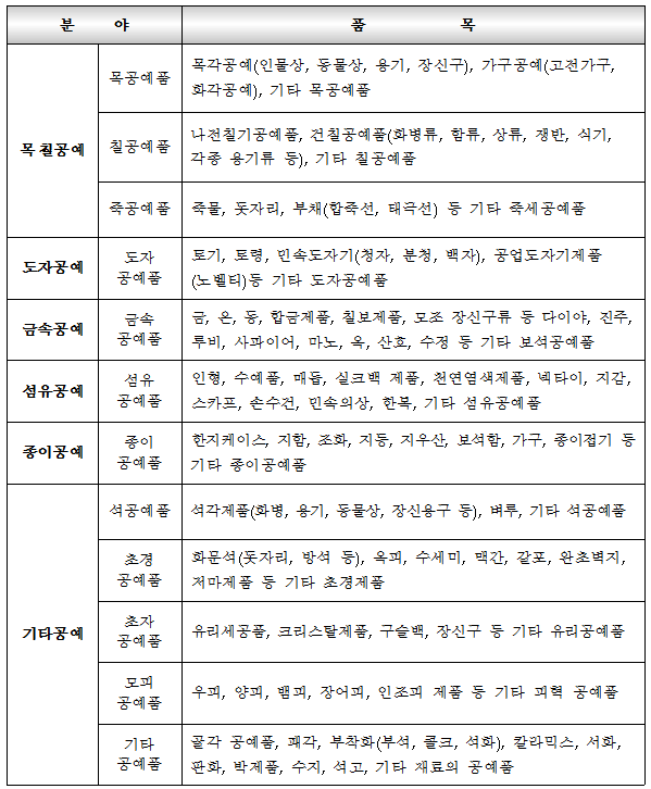 출품대상은 전통공예의 기술과 조형성 등을 기본 바탕으로 현대적 디자인 트렌드에 부합되며, 아름다움과 상품성이 결합된 창의적 공예품이고, 출품분야는 목·칠공예, 도자공예, 금속공예, 섬유공예, 종이공예, 기타공예이다.
