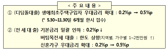 최저 1.6%의 저금리로 디딤돌대출을 이용할 수 있도록 현재 0.2%p 우대금리를 0.5%p로 확대하여, 평균대출자(대출 1억원, 원리금균등상환) 기준 원리금 상환액이 월 53만원 50만원으로 연 36만원, 20년 이용시 총 720만원의 주거 부담이 경감된다.
