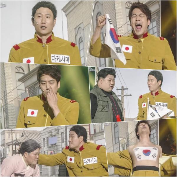 일제 강점기 시절, 일본 영웅은 그렇다 치고 배역 이름까지 많고 많은 이름들 중에 다케시마였다. 조선인들에게 독설과 거침없는 폭력까지 휘둘러야 하는 상황이었다. 관리할 이미지는 원래부터 없었으니 그렇다 하더라도 목숨을 걱정해야하는 연기 설정에 생각이 많아져 자기도 모르게 멈칫 거리는 임우일의 모습이 웃음을 유발했다.
