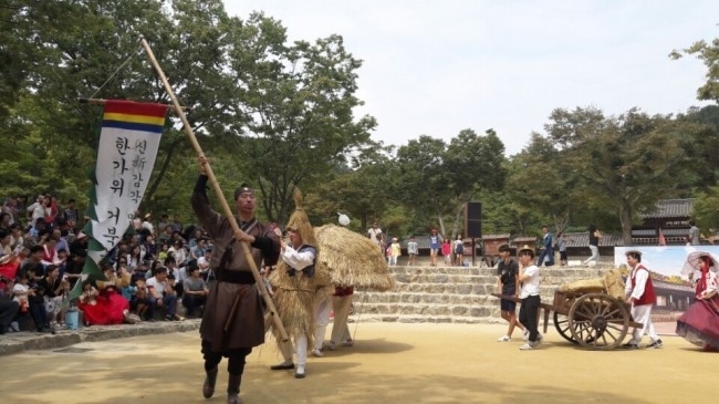민족 대 명정 추석과 함께 임시공휴일을 포함한 열흘 간의 황금연휴가 오는 30일 부터 시작된다. 용인지역 내 각 관광지들은 명절과 연휴를 맞아 각종 이벤트를 진행하고 있다. 특히 한국민속촌은 다음달 9일까지 옛 명절 풍경의 정취를 자아내는 다양한 세시풍송 체험이 포한된 '한가위 좋을씨고' 특별행사를 진행한다. 다음달 6~7일은 제3야전군사령부가 태권도 시범공연을 한다. 이 기간 한복을 입고 민속촌을 찾으면 자유이용권을 최대 48% 할인받을 수 있다. 사진은 지난해 추석당시 진행된 '한가위 좋을씨고' 모습
