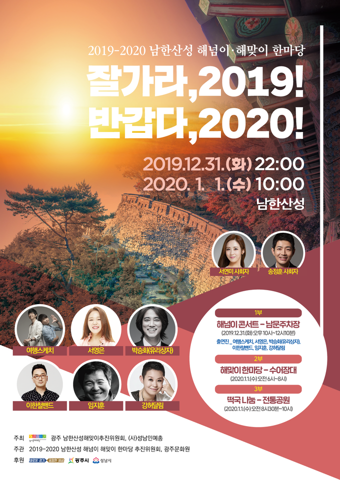 1부 해넘이행사는 ‘잘가라, 2019! 해넘이 콘서트’를 주제로 31일 오후 10시부터 2시간 10분 동안 남한산성 남문주차장 특설무대에서 진행된다.