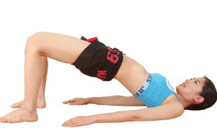 3. 목뒤로 양손을 깍지낀 후 상체는 움직이지 않고 어깨가 땅기도록 팔을 좌우로 당긴다. 심호흡을 길게 해 5회 실시.
