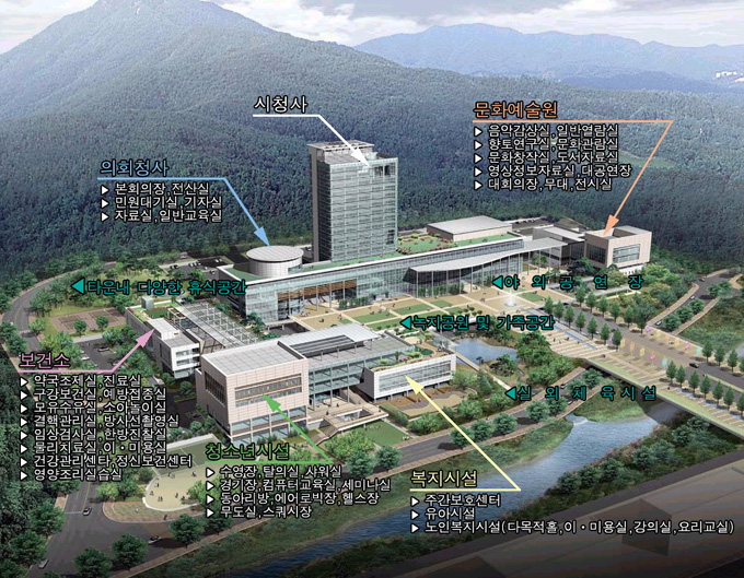 또한 행정타운의 전체면적의 절반 이상이 시민들을 위한 문화․ 복지시설이 들어서게 돼 행정업무 뿐만아니라 여가공간의 장으로 자리 잡을 것으로 보인다. 공공업무시설을 제외한 문화복지시설과 기타부대시설로 어떤 것들이 들어설 것인지 穿틤척?