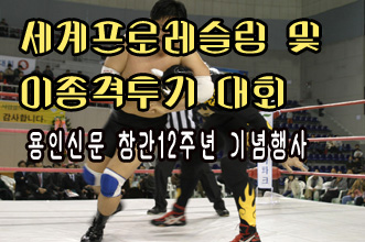 용인신문사가 지난 4일 창간12주년과 지역사랑카드사업을 기념하기 위해 마련한 AWF 세계 JR헤비급 타이틀매치 프로레슬링 대회와 이종격투기 대회가 성황리에 끝났다. <화보는 디지털사진클럽>