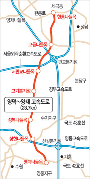 용인시 영덕지구에서 시작돼 수원 이의 신도시 개발예정지구, 성복·신봉지구를 거쳐 성남 판교신도시를 거치는 이 도로는 서울 헌릉로까지 이어지며 24개의 다리(4482m)와 9개의 터널(6728m)이 건설, 왕복 4~6차로로 건설될 예정이다.