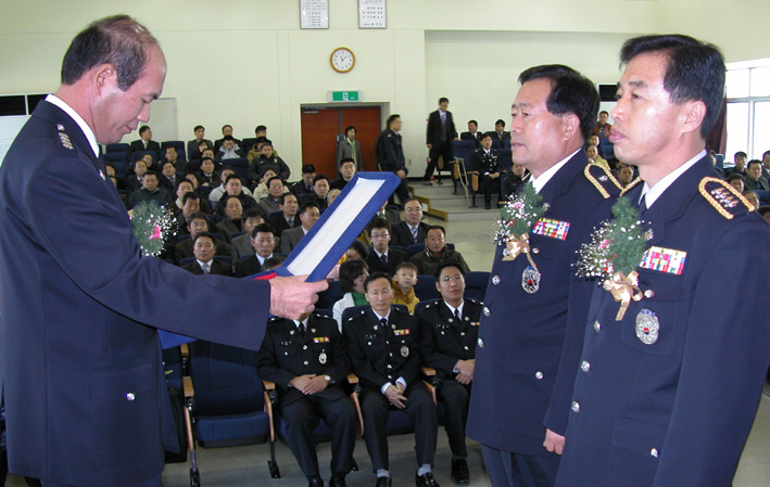 퇴임식은 공로패와 재직기념패 전달과 이재영 서장의 금일봉, 청소년지도위원회의 행운의 열쇠 전달, 송사 및 답사 순으로 진행됐다.