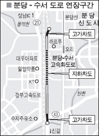 12일 경기도에 따르면 도 건설본부는 용인 서부지역의 교통난 해소를 위해 분당∼수서 고속화도로(청담대교∼구미동)를 성남시 분당구 금곡동 시그마Ⅱ에서 풍덕천 삼거리 국지도 23호선까지 연장키로 하는 ‘분당~수서 고속화도로 연장공사’를 추진할 계획.