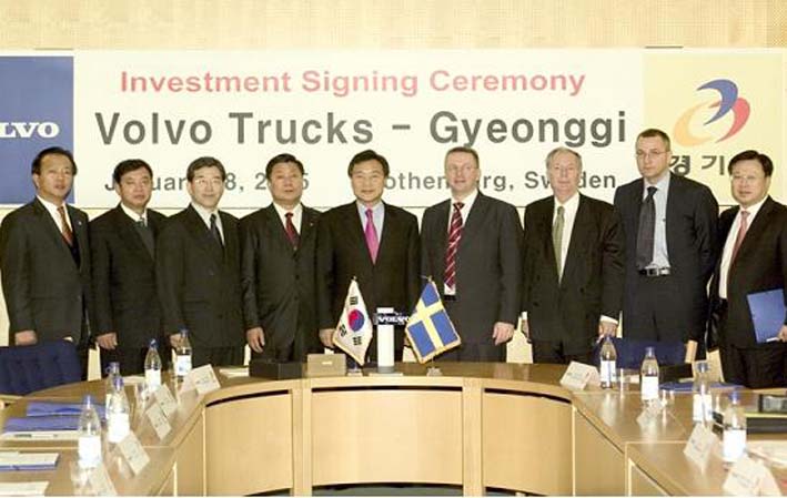 유럽지역 첨단기업 투자유치를 위해 스웨덴을 방문중인 손학규 경기도지사가 18일 오전(현지시간) 예테보리의 볼보그룹 본사에서 볼보트럭코퍼레이션 인터내쇼날 디비젼의 대표이사 클라스 스웨드베그(Claes Svedberg)와 화성 동탄지역에 1천만달러를 투자하여 국내의 부품정비, 판매, 정비기술교육 등 A/S기능을 총괄하는 테크니컬센터를 설립하기로 투자협정(MOU)을 체결했다.