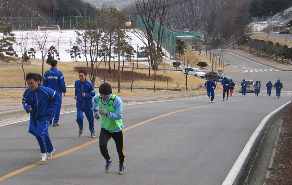 귀가 떨어져나갈 정도로 춥지만 운동장을 달린 회원들은 금새 추위를 떨쳐내고 이내 총신대를 향해 교문을 달려나간다.