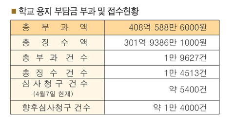 지난 8일 용인시에 따르면 지난 2001년이후 총 1만 9627세대에 408억여원을 부과했으며 총 1만 4513세대에게 301억여원의 학교용지부담금을 징수했다.(표 참조)