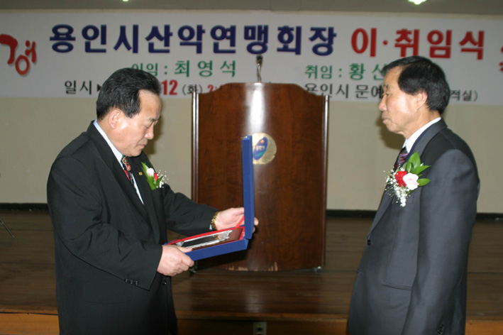 용인시생활체육연합회 산악연맹 회장 이취임식이 지난 12일 문예회관 다목적실에서 열렸다.