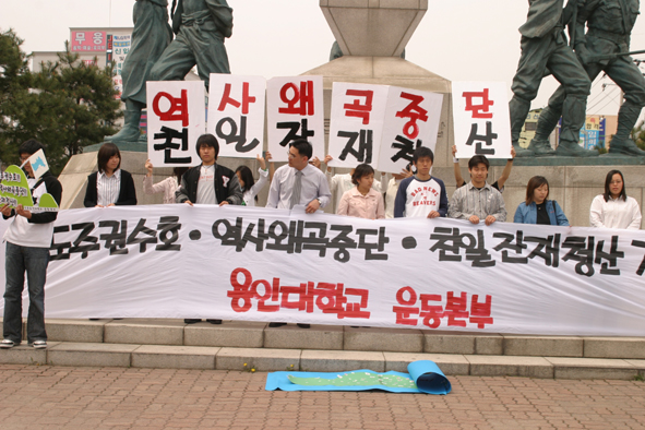 용인대학교 총학생회는 지난 19일 중앙동 통일공원 독립항쟁기념비 앞에서 단과대학 학생회, 동아리연합회 등이 참석한 가운데 ‘독도주권 수호를 위한 용인대 운동본부’를 발족하고 최근 일본의 독도영유권 주장과 교과서 왜곡을 제2의 침략행위라고 규정, 강력 대처하기로 했다.