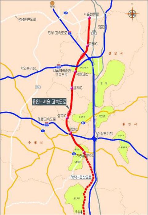 용인~서울 고속도로는 용인시 기흥읍 영덕리와 서울 헌릉로를 연결하는 22.9㎞ 도로로 구간 중간에 5개의 인터체인지(상현ㆍ성복ㆍ고기ㆍ판교ㆍ고등IC)가 설치되며 2008년 완공을 목표로 하고 있다.