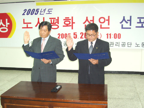 조정희이사장과 노조위원장등 50여명이 참여한 이번 선언을 통해 노사 양측은 2005년을 공단경영혁신의 해로 정하고 상호신뢰와 존중을 바탕으로 소모적인 대립관계 대신 생산적인 노사문화로 공단분위기를 바꾼다는 것.