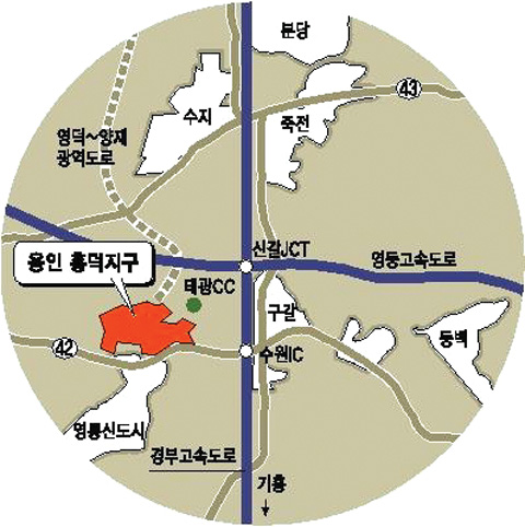 또한 2008년말 개통예정인 용인~서울간 고속도로가 흥덕지구를 관통하고 있어 서울 강남권으로 바로 연결되고, 광교테크노밸리를 통과하는 정자~수원간 신분당선 연장 광역전철을 이용할 수 있어 대중교통도 원활한 편이다.