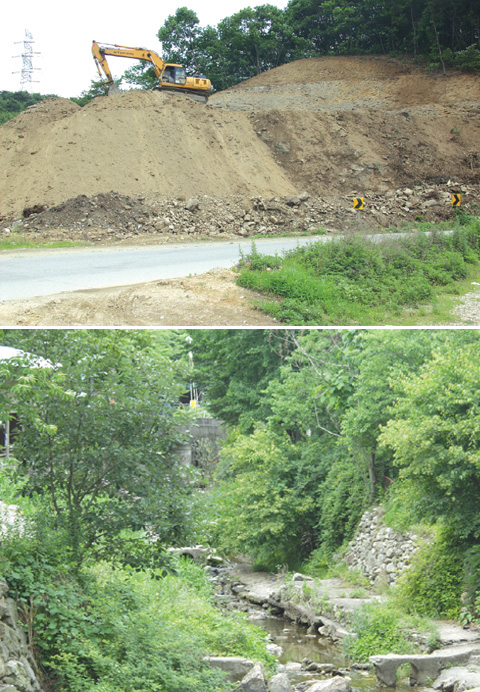 사진은 고기동 계곡 입구에 방치돼 있는 공사현장(상)과 물이 사라지고 있는 계곡.